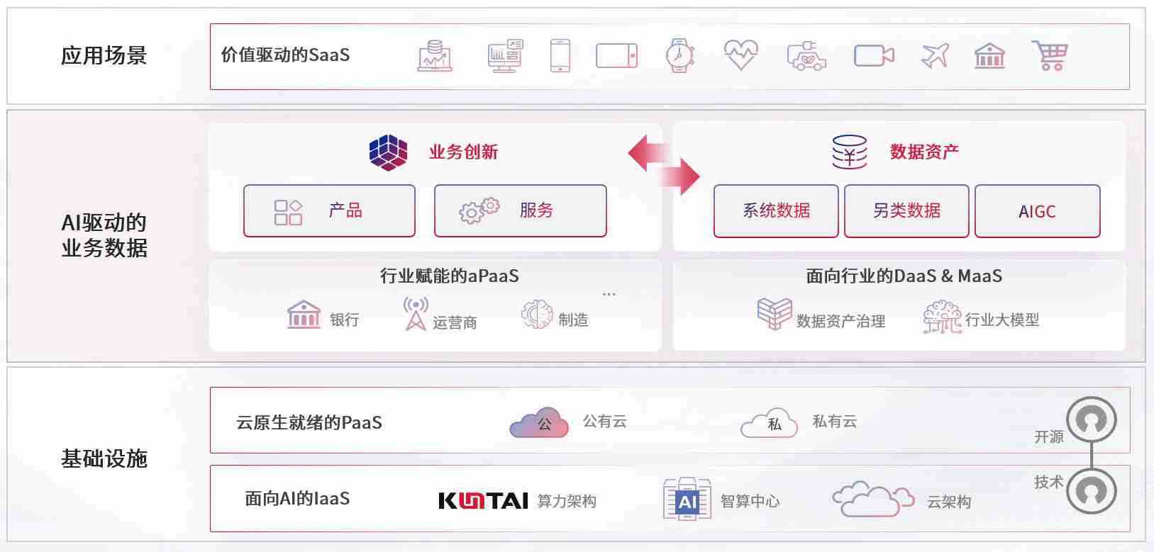 在基础设施层面,,,基于商业或开源的云原生就绪开发工具与技术组件(PaaS)和面向AI的底层公共基础设施资源(IaaS),,,,将共同支撑企业完成数字化转型