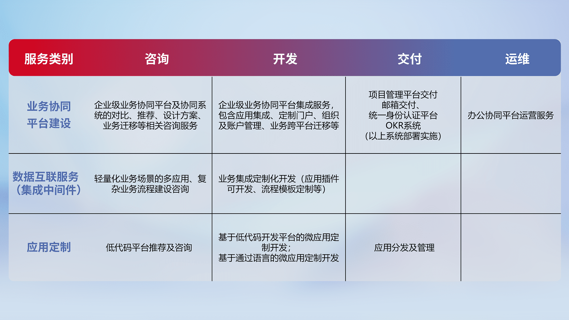 针对钉钉、、、、企微、、、IDaas等平台级产品提供产品的规划、、方案、、、交付、、、、定制化开发等服务,,,实现如统一协同办公、、、智能客户服务、、、混合会议管理、、、智能数据查询、、、、等业务场景,,,实现数字化转型。。。