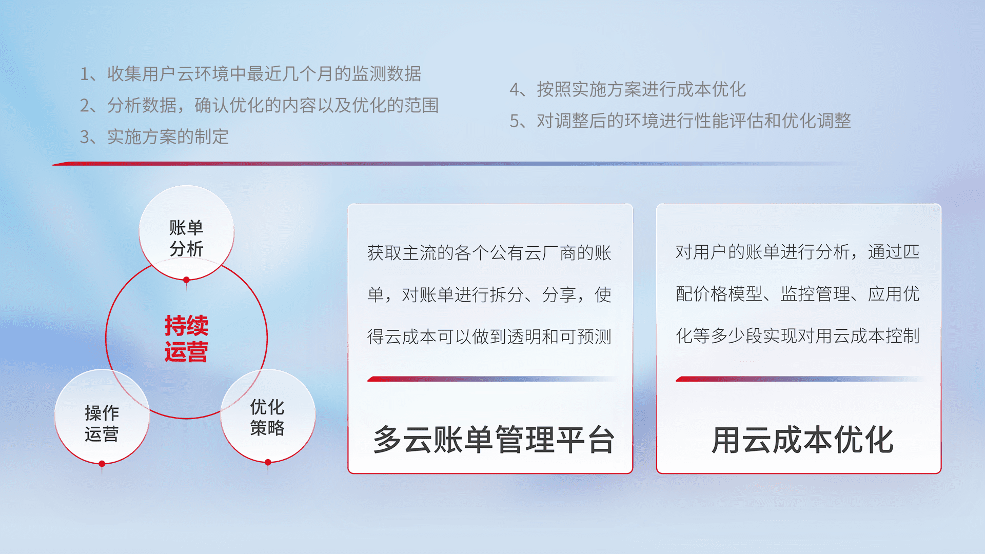 通过多云纳管,,,,以统一的资源数据模型把客户的云资源进行抽象和封装,,进而实现对多云资源的统一操作,,保障云资源管理的可靠性、、稳定性与可用性。。量身定制化运维内容,,配置、、、开发运维、、、补丁管理、、备份、、、监控、、、认证和访问管理、、、、审计和日常巡检等,,保障在用云过程中的可靠度,,,,稳定度以及高可用率。。