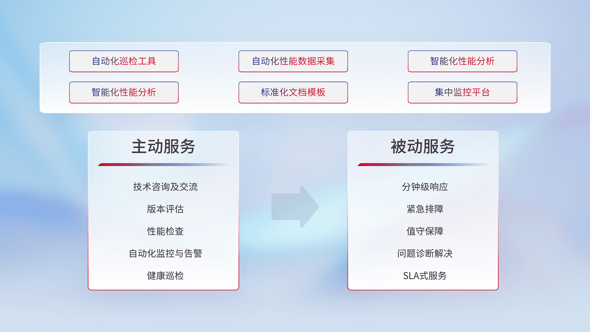 智能化工具和标准化文档,,,,保障服务质量,,提供主动服务(包含技术咨询、、、、版本评估、、、、性能检查、、、自动化监控与告警、、、、健康巡检)和被动服务包含(分钟级响应、、紧急排障、、、、值守保障、、、、问题诊断解决、、、SLA服务)。。。。